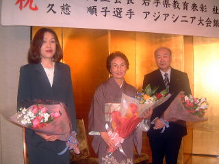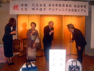 吉田几生会長の2003年度岩手県教育表彰と久慈順子選手の第7回アジアシニアボウリング選手権大会銀メダル獲得を祝う祝賀会が場協会はじめボウリング場関係者の方々と各支部から多数の参加を頂き盛岡のホテル ルイズにて盛大に開催されました。