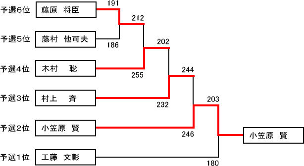☆男子ミドルの部 | 順位 | 選手名 | 所 属 | 得 点 | | 1位 | 工藤 文彰 | 創環社 | 3,304 | | 2位 | 村上 斉 | トッパンマルチ