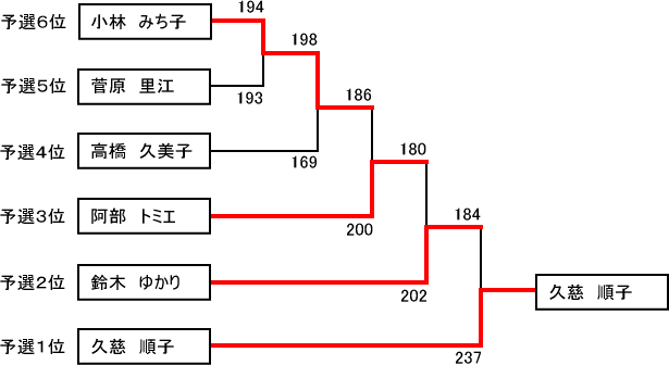 ☆女子ミドルの部 | 順位 | 選手名 | 所 属 | 得 点 | | 1位 | 小笠原由美子 | ムラタ | 2,838 | | 2位 | 阿部 暁美 | 三陸平庄 | 2,710 | |