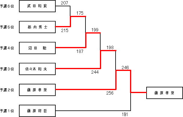 ☆男子マスターズの部 | 順位 | 選手名 | 所 属 | 得 点 | | 1位 | 佐々木 和夫 | 薫山工房 | 5,520 | | 2位 | 大平 恵介 | フジテクニカル | 5,432 | |