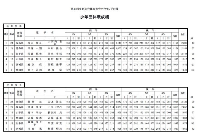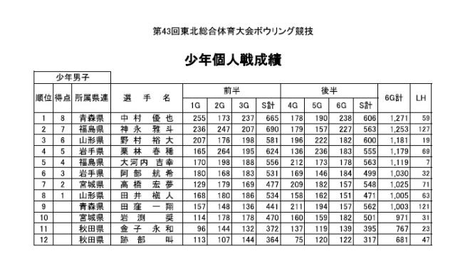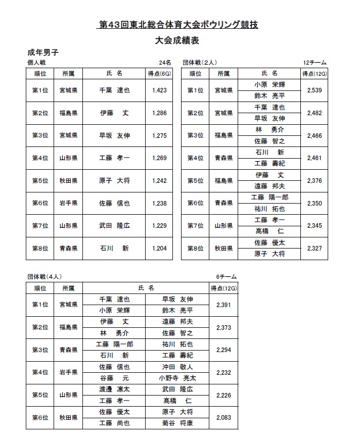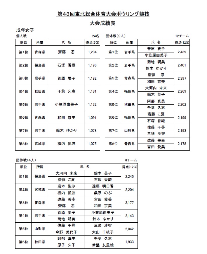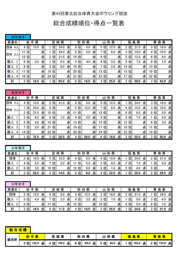 青森県で開催された第43回東北総合体育大会ボウリング競技で、岩手は総合3位に