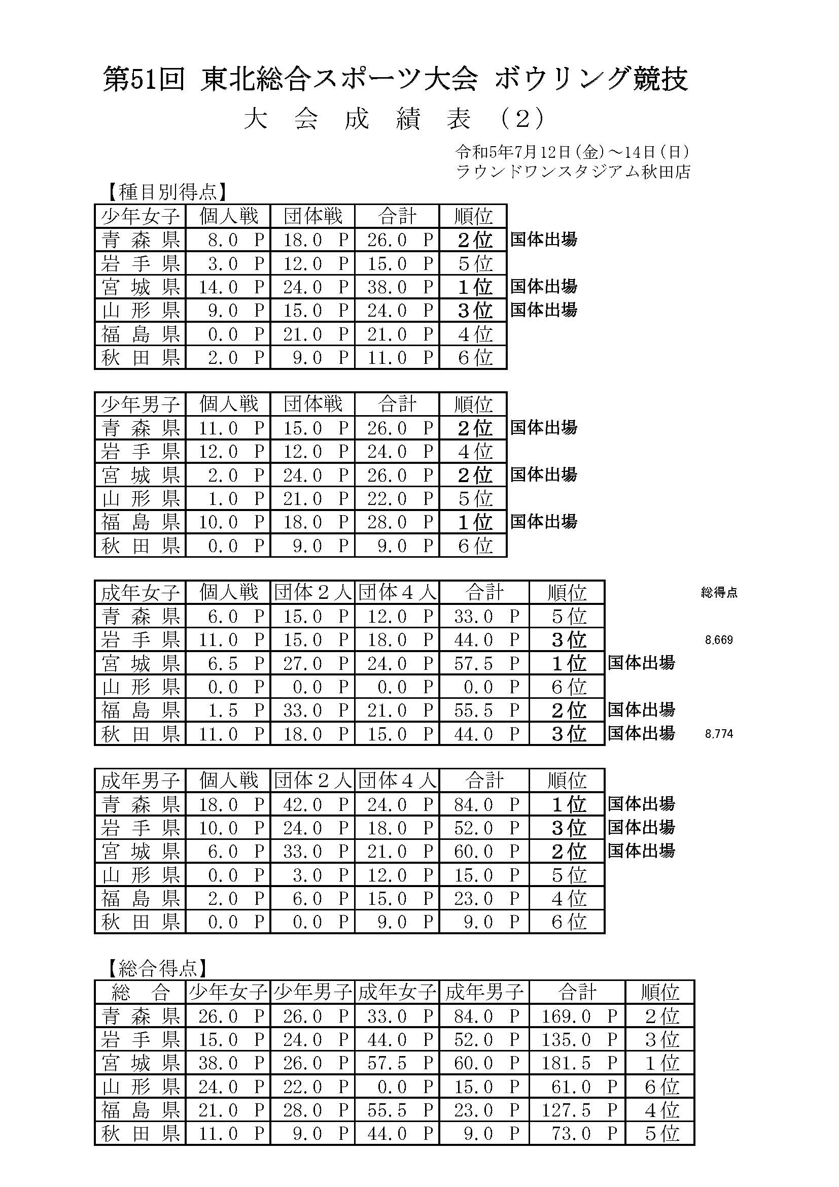 7月12日から秋田県で令和6年度国民スポーツ大会東北ブロック大会兼第51回東北総合スポーツ大会ボウリング競技が開催されました。(詳細成績は上部の成績表リンクからご覧ください)